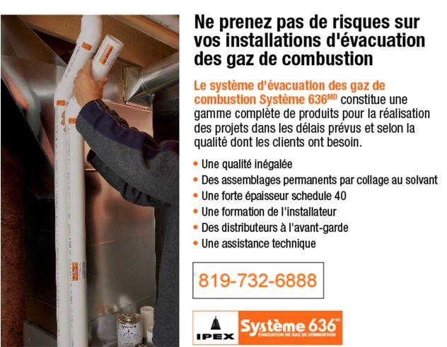 Les systèmes d'évacuation en matière plastique utilisés sur les chauffeeau, appareils de chauffage et chaudières au gaz ont fait l'objet de changements substantiels. Le code d'installation du gaz naturel et du propane CSA B149.1 exige maintenant que les matériaux spéciaux utilisés pour l'évacuation des gaz soient certifiés selon ULC S636 dans tout le Canada. IPEX a répondu à cette demande sur le marché en proposant le Système 636, entièrement certifié pour l'évacuation des gaz de combustion.