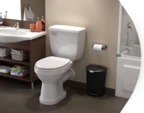 L'unité du Saniaccess 3 doit être connectée à notre décharge arrière de toilette.  Ce système utilise beaucoup moins d'eau qu'une toilette régulière car il utilise seulement 1,28 gpc (4.8 litres) d'eau par flush.  Remarque : Cette toilette fonctionne uniquement en combinaison avec le Saniaccess 3.