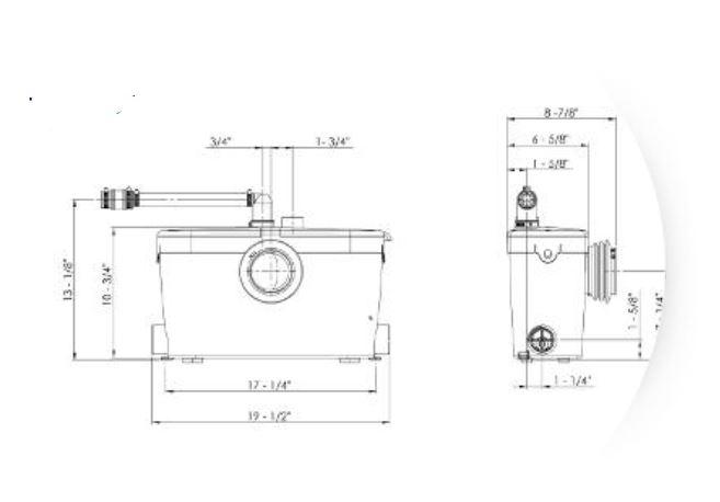 Les eaux uses provenant des autres appareils sanitaires sont évacuées dans le Saniaccess 3 par le biais de deux orifices d’entrée de 2 po, situés de chaque côté du carter.  Selon les besoins, il est possible d’utiliser soit un orifice d’entrée, soit les deux.  Le coude d’évacuation situe sur le dessus du Saniaccess 3 peut se tourner vers la gauche ou la droite selon l’installation de la tuyauterie d’évacuation. Un simple clapet anti retour à bille est donc incorpore.