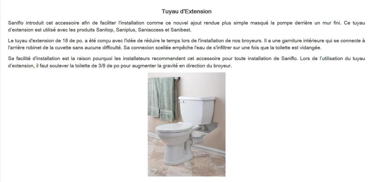 Tous les éléments peuvent être achetés séparément.  Toutefois, le Saniaccess 3 fonctionne comme un système et une cuvette, réservoir de la toilette et l'unité broyeur doivent donc être acheté.  Un tuyau d'extension facultative est disponible pour la pompe doit être installé derrière le mur.  Aucun siège de toilette, armoires, douche, ni baignoire ne sont inclus. .